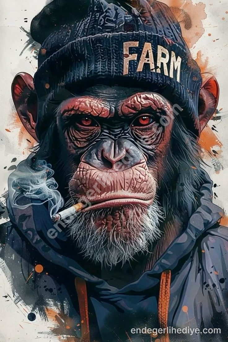 Duvarlarınıza sıra dışı bir dokunuş katın! 'Farm' yazılı beresi, derin kırmızı gözleri ve asi duruşuyla bu şempanze, izleyeni etkisi altına alan benzersiz bir karaktere sahip. Ağzındaki sigara ve dumanıyla adeta bir hikaye fısıldayan bu kanvas tablo, modern sanatın ve sokak stilinin cesur birleşimi. Evinizin veya ofisinizin havasını anında değiştirecek, sohbetlerin odak noktası olacak bu eser, sadece bir tablo değil, bir yaşam felsefesidir. Tarz sahibi mekanlar yaratmak isteyenler için mükemmel bir seçim.
