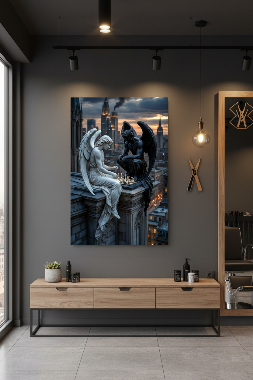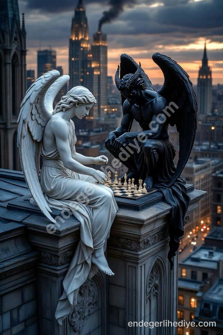 Bu büyüleyici kanvas tablo, iyi ve kötü arasındaki ebedi mücadelenin, stratejinin ve kaderin nefes kesen bir yansımasıdır. Beyaz bir meleğin zarafeti ile karanlık bir şeytanın gücü, bir satranç tahtası etrafında buluşuyor. Gün batımının altın ve mor tonlarıyla aydınlanan şehir silüeti, bu epik karşılaşmaya dramatik bir fon oluşturuyor. Mekanınıza derinlik, düşünce ve mistik bir hava katarken, izleyenin ruhunda derin izler bırakacak sanatsal bir başyapıt. Oturma odanızda, çalışma odanızda veya ofisinizde, her bakışta yeni bir anlam keşfetmenizi sağlayacak, eşsiz bir sohbet başlatıcıdır. Renklerin ve gölgelerin ustaca kullanımı, bu eseri sadece bir tablo olmaktan çıkarıp, adeta yaşayan bir hikayeye dönüştürüyor.