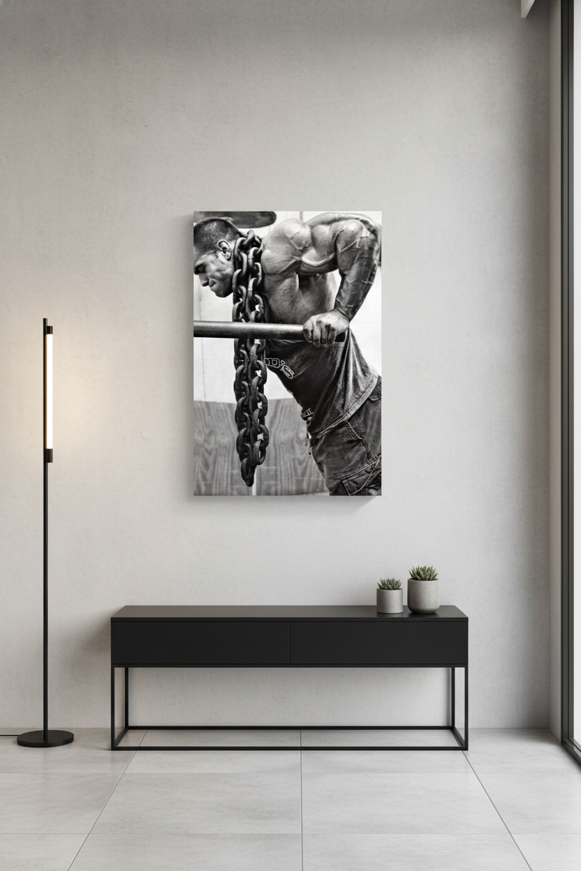 Bu etkileyici kanvas tablo, demir zincirlerle ağırlıklandırılmış bir dip egzersizi yapan kaslı bir sporcunun azmini ve gücünü yansıtır. Her bir kasın çizgisi, her bir ter damlası, spor salonunun zorlu atmosferini ve kişisel sınırların ötesine geçme arzusunu fısıldar. Siyah beyaz tonlar, figürün ve zincirlerin çarpıcı detaylarını vurgulayarak, mekanınıza derinlik ve dramatik bir enerji katar. Bu tablo, sadece bir dekorasyon öğesi değil, aynı zamanda kararlılığın ve sürekli gelişimin bir sembolüdür. Antrenman alanınızda, ofisinizde veya yaşam alanınızda bu ilham verici görselle motivasyonunuzu yükseltin. Kasların estetiğini ve çelik gibi iradenin gücünü duvarlarınıza taşıyın.