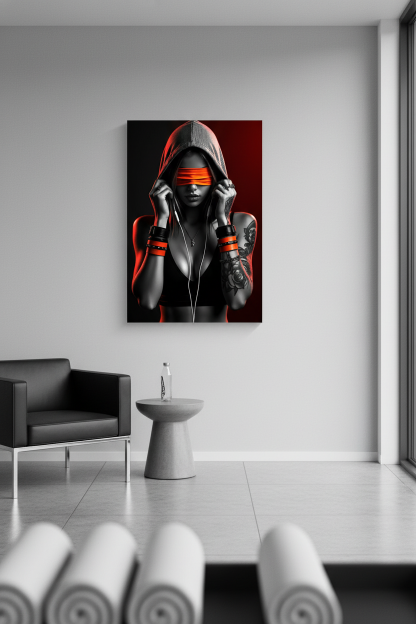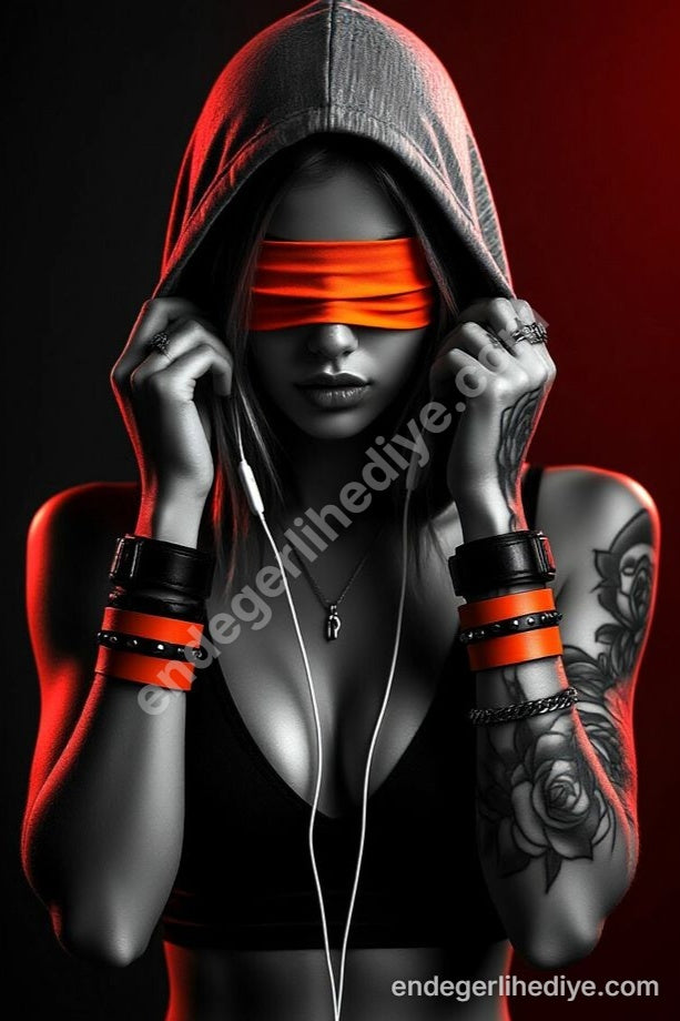 Bu büyüleyici kanvas tablo, gizemli bir kadının gücünü ve iç dünyasını yansıtır. Gözlerini saran turuncu bant, dış dünyaya kapalı ancak ruhu ritimle atan bir duruş sergilerken, kapüşonu ve dövmeleri modern bir isyanın ve özgünlüğün simgesidir. Kırmızı ve siyahın dramatik kontrastı, mekana derinlik ve tutku katarak, sıradanlığı aşan bir atmosfer yaratır. Evinizin veya spor salonunuzun duvarlarında güçlü bir odak noktası olacak, izleyenin merakını uyandıracak ve onlara kendi iç ritimlerini bulmaları için ilham verecektir. Bu tablo, sadece bir dekorasyon objesi değil, aynı zamanda bir yaşam felsefesinin ve estetiğin dışavurumudur. Tarzınıza cesaret katın ve mekanınızı sanatla dönüştürün.