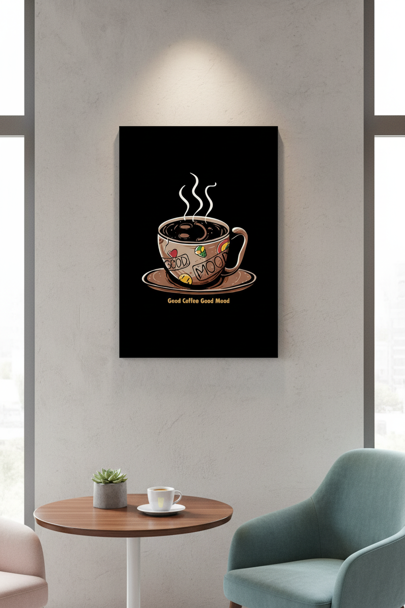 Sabahın ilk ışıklarıyla uyanan bir ruh hali için tasarlanmış bu özel kanvas tablo, kahve severlerin kalbini fethedecek. Buharı tüten sıcak bir fincan kahvenin etrafında dans eden "Good Mood" yazısı ve neşeli emojiler, gününüze pozitif bir başlangıç yapmanız için ilham veriyor. Siyah arka plan üzerinde sıcak kahve tonlarının ve renkli detayların büyüleyici uyumu, mutfağınızdan oturma odanıza, hatta ofisinize kadar her mekana enerji katacak. Bu tablo, sadece bir dekorasyon öğesi değil, aynı zamanda her baktığınızda size iyi hissettirecek bir sanat eseri. Sevdiklerinize hediye edebileceğiniz veya kendi yaşam alanınızı renklendirebileceğiniz bu eşsiz parça ile her gün "İyi Kahve, İyi Ruh Hali" sizinle olsun.