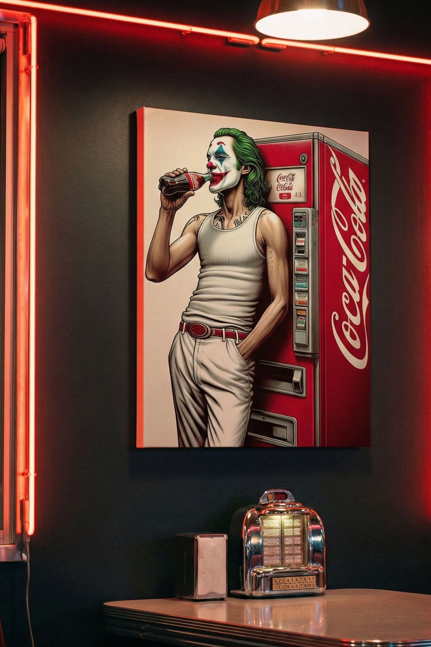 40×60 cm ebatlarında, mat dokulu, yüksek çözünürlüklü Joker + Coca-Cola retro illüstrasyon posteri. Asi, retro ve dikkat çekici konseptiyle özellikle burgerciler, kafeler ve genç kitleye hitap eden mekanlar için mükemmel dekor ürünü.