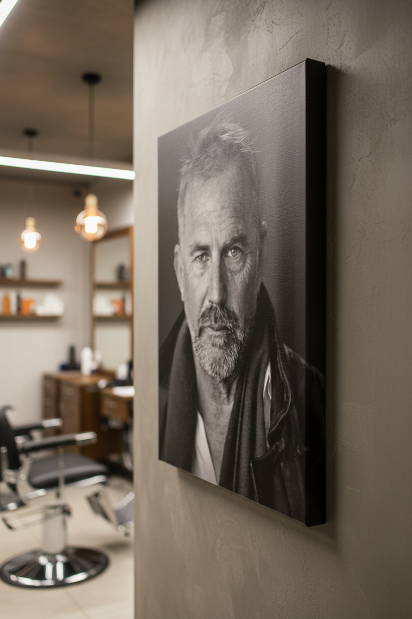 Bakışlarıyla derinlikleri fısıldayan, zamansız bir karizmaya sahip bu beyefendi portresi, mekanınıza eşsiz bir atmosfer katacak. Siyah beyazın asil kontrastında yansıyan her çizgi, yaşanmışlıkların ve bilgeliğin hikayesini anlatıyor. "Bay Kuaför" koleksiyonumuzdan çıkan bu özel parça, ister bir salonun duvarını süslesin, ister bir ofise karakter katsın, her bakışta ilham verici bir duruş sergiliyor. Kaliteli kanvas üzerine özenle basılmış bu eser, odanızın estetiğini bir üst seviyeye taşıyacak, modern ve klasik çizgileri bir araya getiren bir sanat şaheseridir.