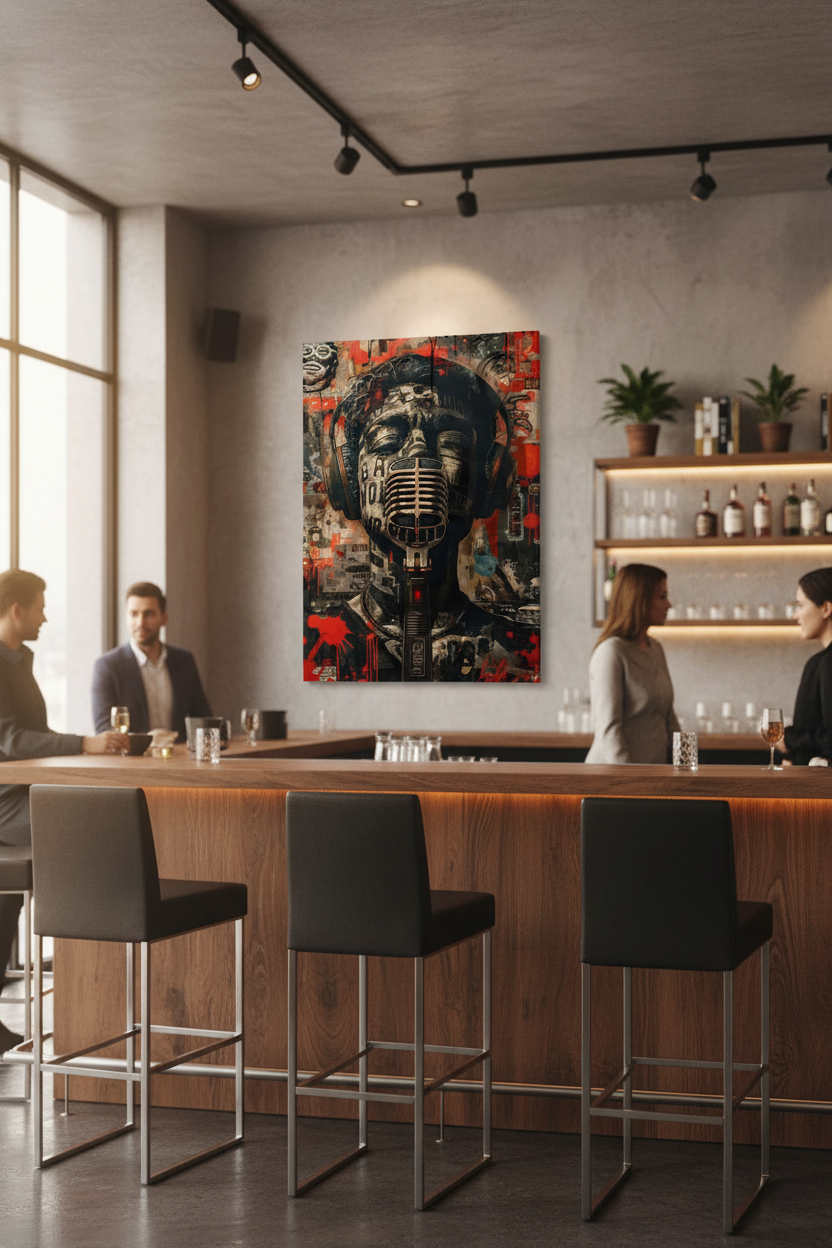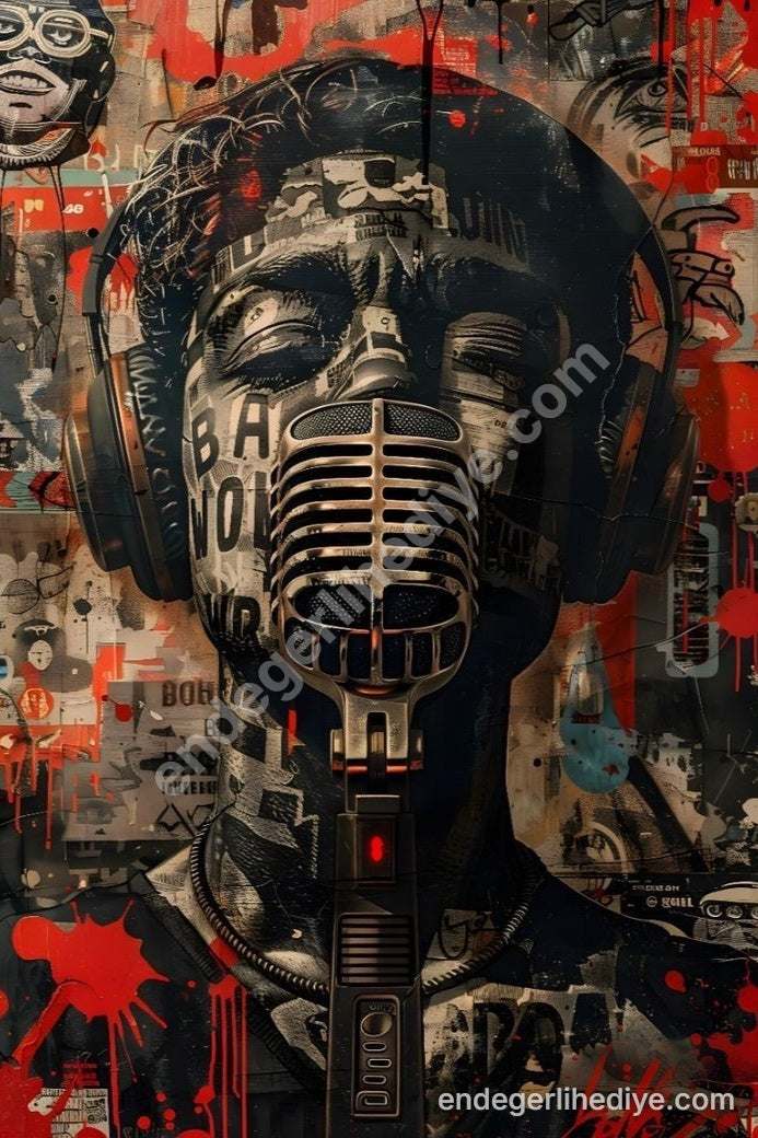 Bu eşsiz kanvas tablo, müziğin ruhunuzdaki derin yankısını ve şehir sanatının özgür ruhunu evinize taşıyor. Dinamik fırça darbeleri ve cesur renk patlamalarıyla bezenmiş bu eser, bir mikrofonun ardında kaybolmuş, müziğin akışına kendini bırakmış bir ruhu tasvir ediyor. Koyu tonların hakimiyeti, kırmızı ve sıcak altın detaylarla harmanlanarak görsel bir şölen sunar.