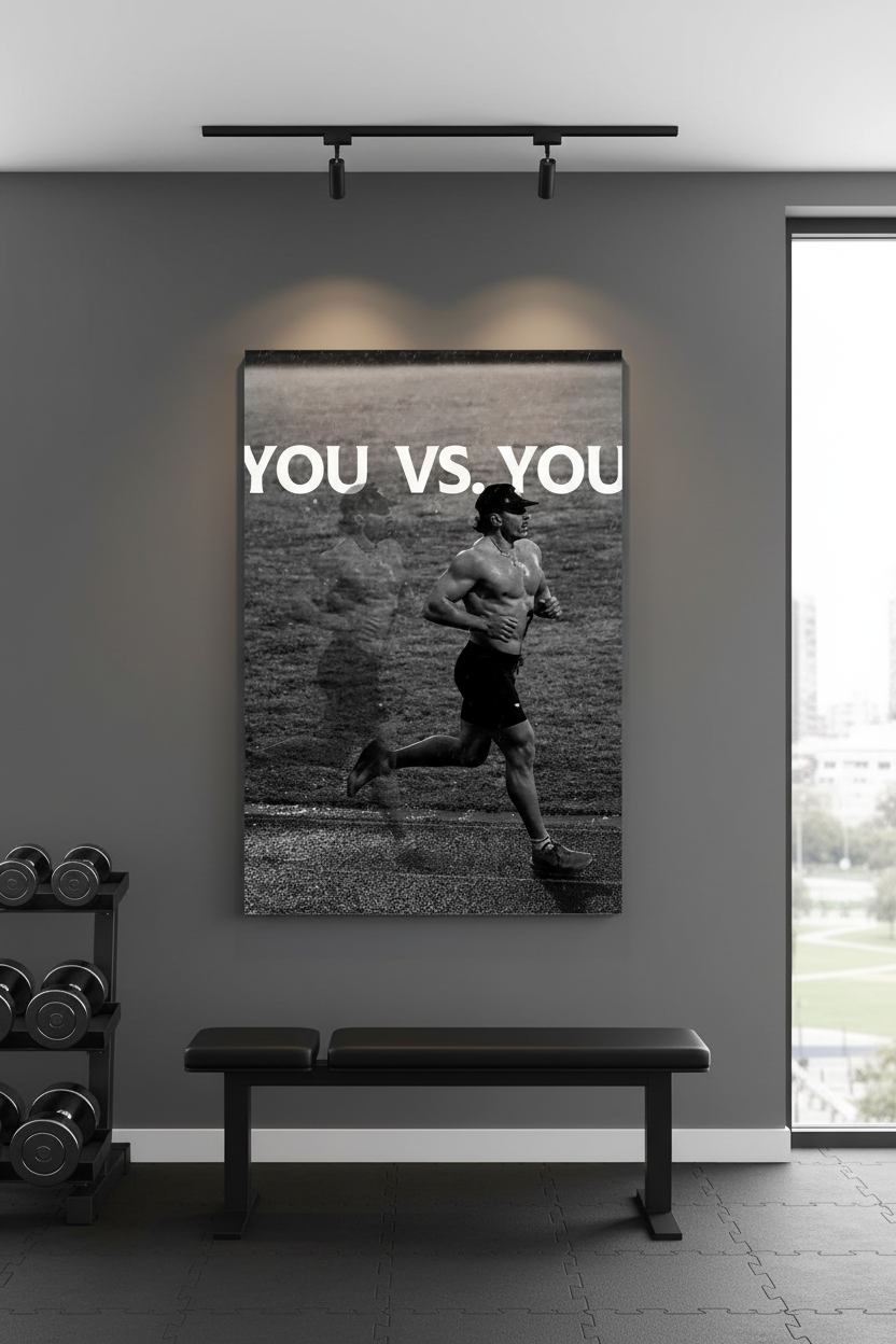 Bu kanvas tablo, bir koşucunun yağmur altında kendi yansımasıyla mücadelesini ve "YOU VS. YOU" mesajını siyah beyazın etkileyici tonlarında yansıtıyor. Her bir antrenmanın, her bir mücadelenin aslında kendinle olduğunu hatırlatan bu eser, salonunuzda, çalışma odanızda ya da kişisel spor alanlarınızda ilham verici bir odak noktası olacak.