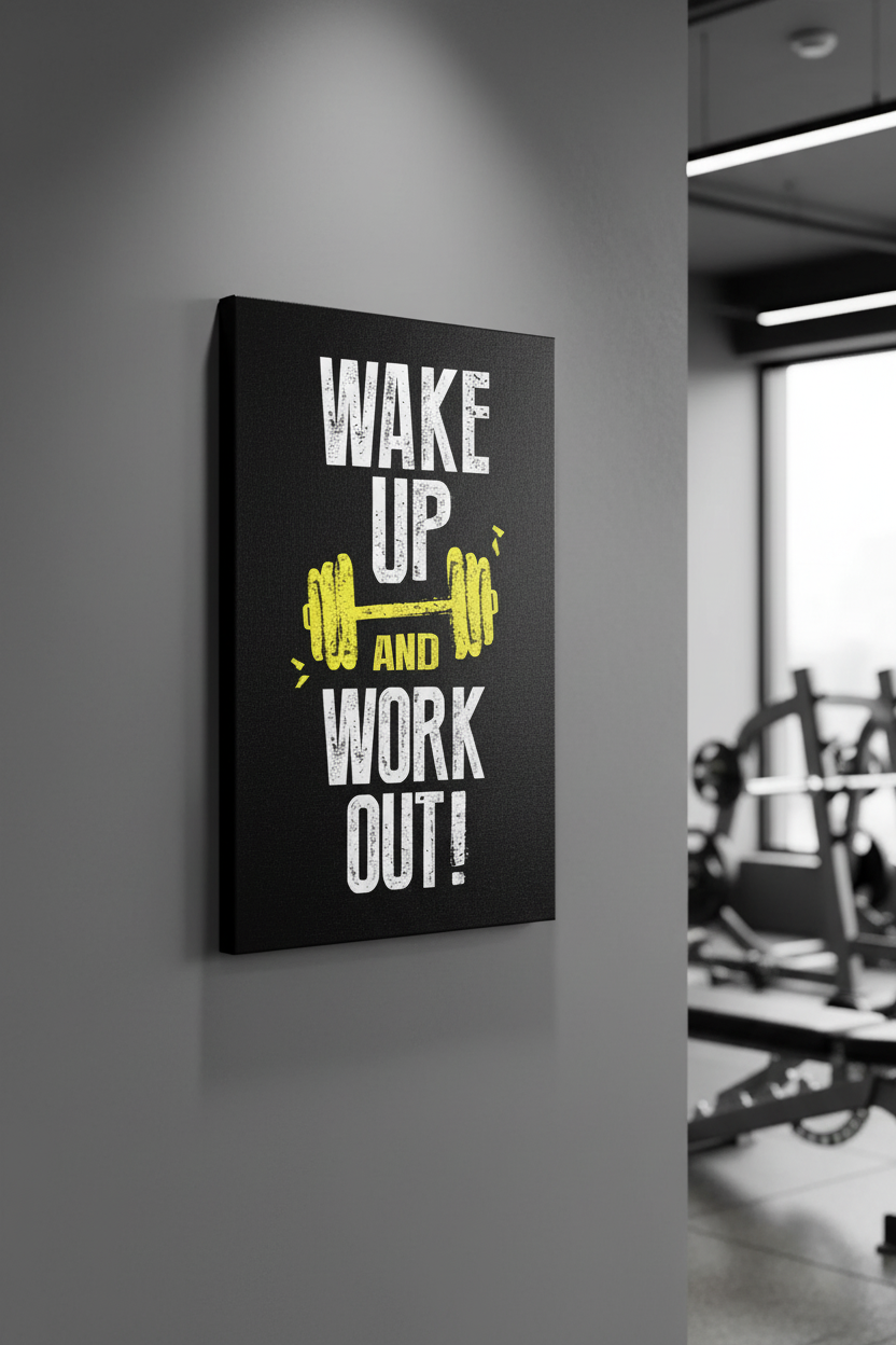 Canlı sarı dambıl ve cesur 'WAKE UP AND WORK OUT!' yazısı, siyah zemin üzerinde çarpıcı bir kontrast oluşturarak odanıza modern ve ilham verici bir atmosfer getiriyor. İster spor odanızda, ister yatak odanızda ya da ofisinizde olsun, bu tablo spor ve sağlıklı yaşam tutkunuzu her an hatırlatacak.