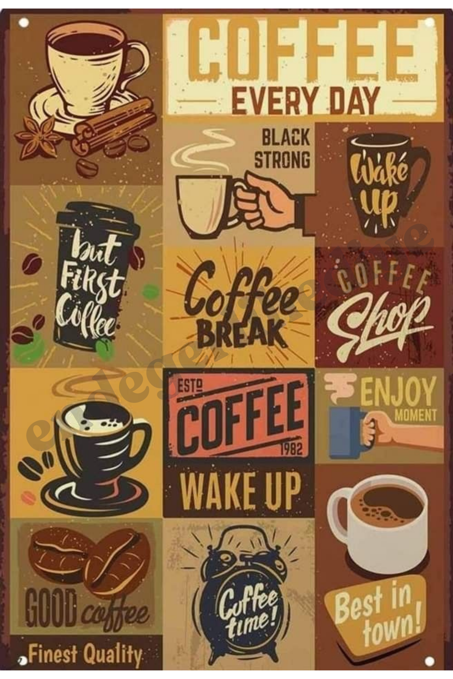 Farklı tipografi stilleri, kahve ikonları ve sıcak tonlu illüstrasyonların birleştiği bu kolaj, duvarda zengin bir görünüm sağlar.