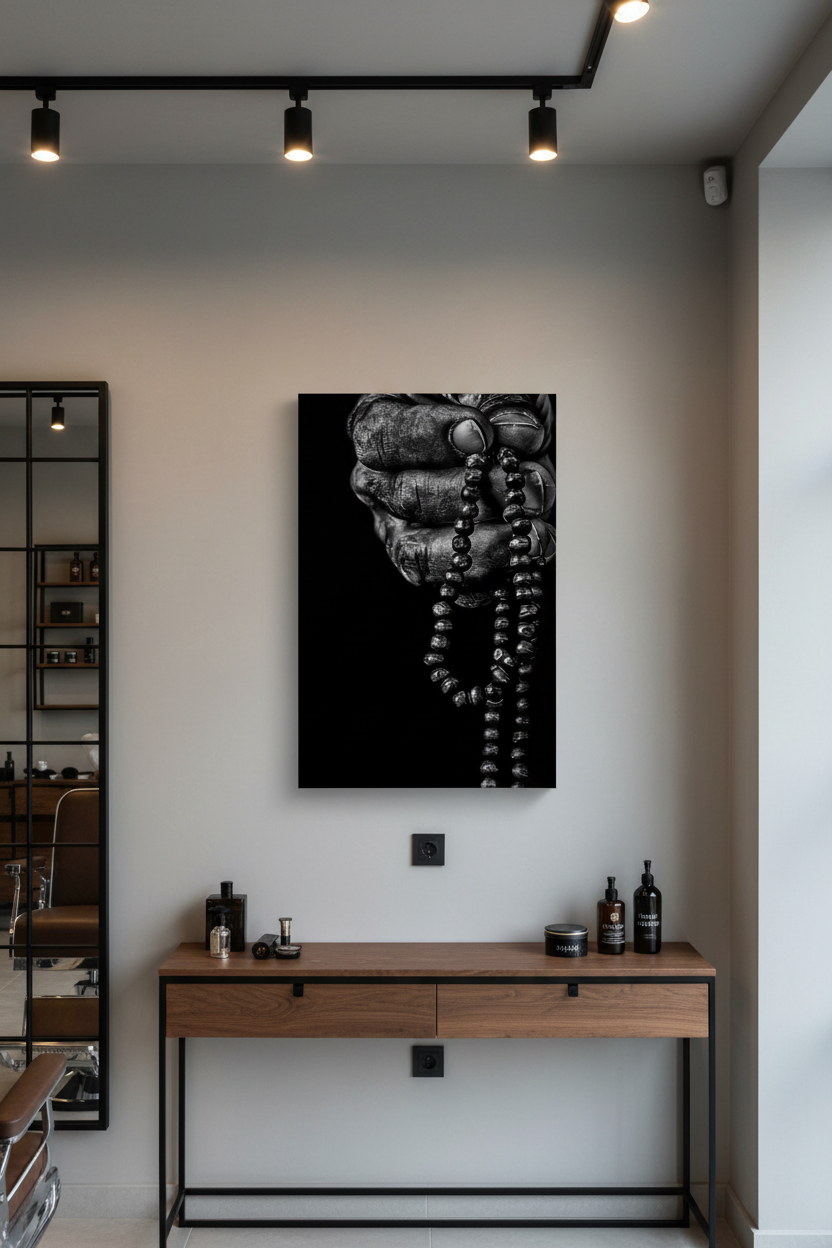 Bu kanvas tablo, zamanın ve deneyimlerin işlediği derin çizgileriyle yaşlı bir elin tesbihi kavrayışını siyah beyazın asil tonlarıyla gözler önüne seriyor. Her bir kırışıklık, yaşanmış bir öyküyü, her bir tesbih tanesi ise huzurun ve sabrın yankısını fısıldıyor.